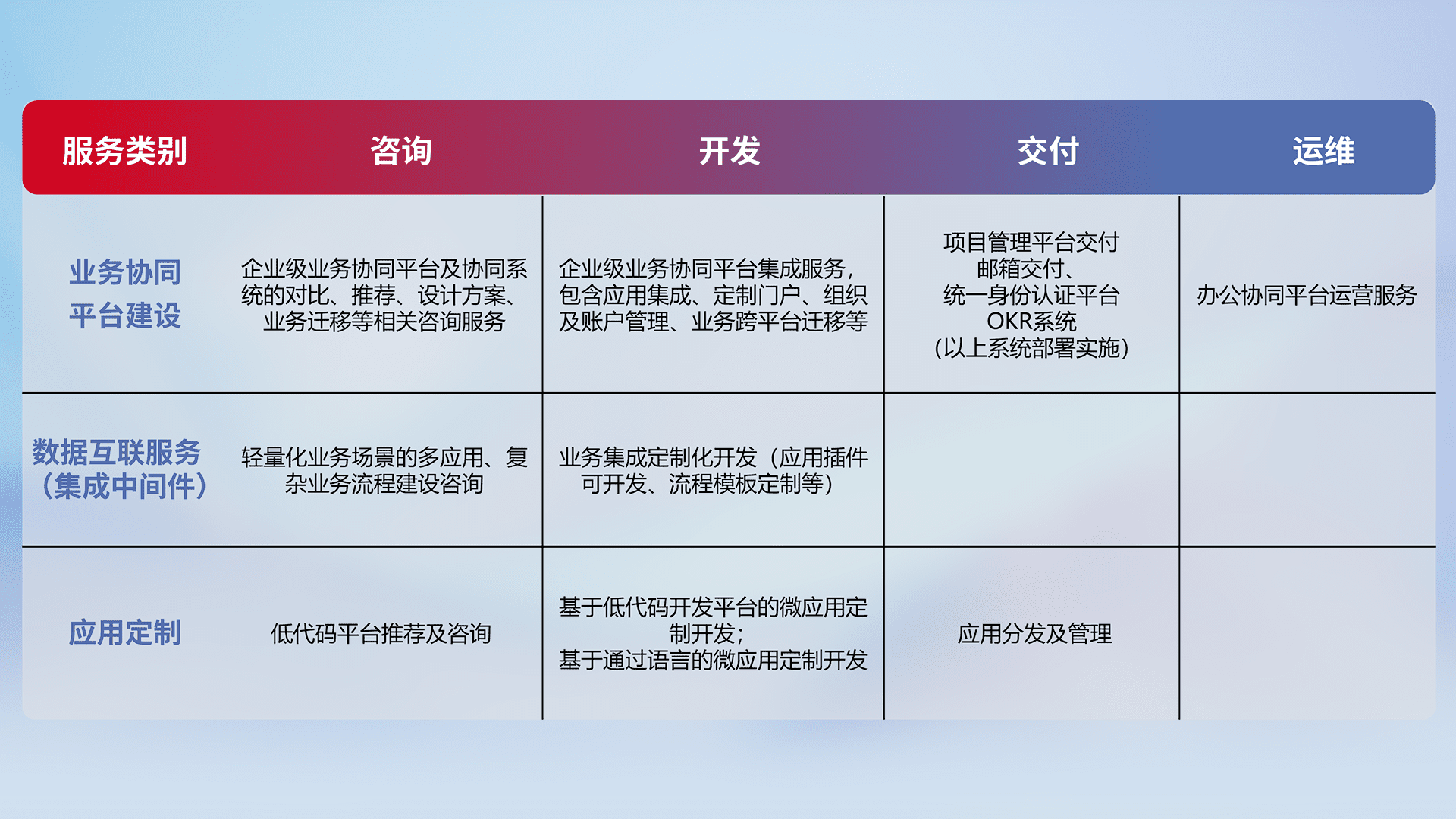 针对钉钉、、企微、、、、IDaas等平台级产品提供产品的规划、、、、方案、、、、交付、、、、定制化开发等服务,,实现如统一协同办公、、、、智能客户服务、、混合会议管理、、、智能数据查询、、等业务场景,,,实现数字化转型。。